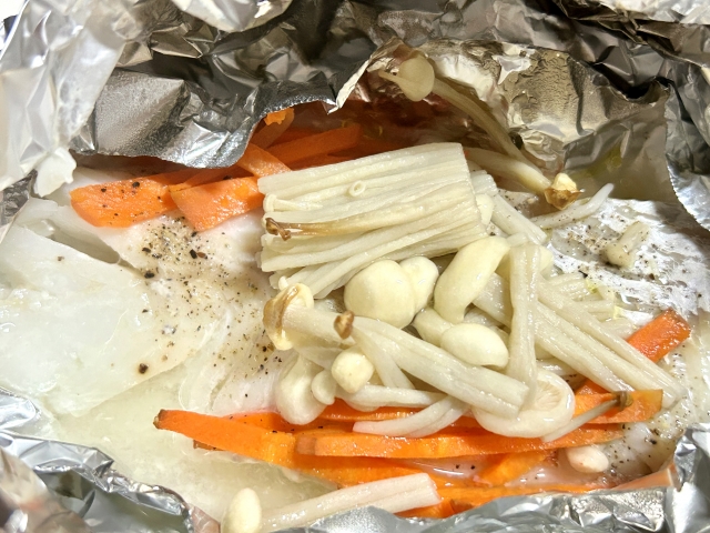 野菜の半分を下に敷いて、残りを上にのせると野菜のうまみが魚にしみ込むのでおすすめです。