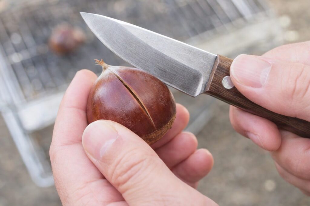 焚き火で焼き栗を爆発させないポイントは、必ず切れ目を入れることです。